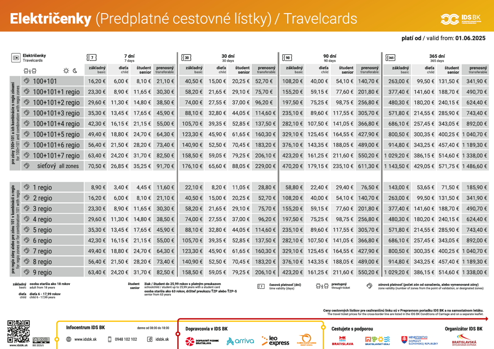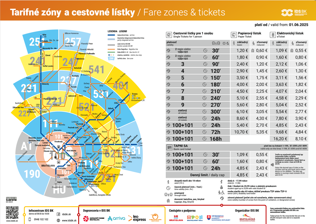 You can find the fare prices in the Price List or in the section dedicated to Travelcards. When looking up a ticket for a journey in the region or between the zone 101 and the region, look at the table giving the prices for a certain number of regional zones. When travelling between the inner city of Bratislava (zone 100) and the region, look at the table giving prices for the combination of zones 100+101+ a certain number of regional zones.